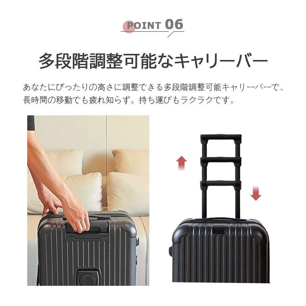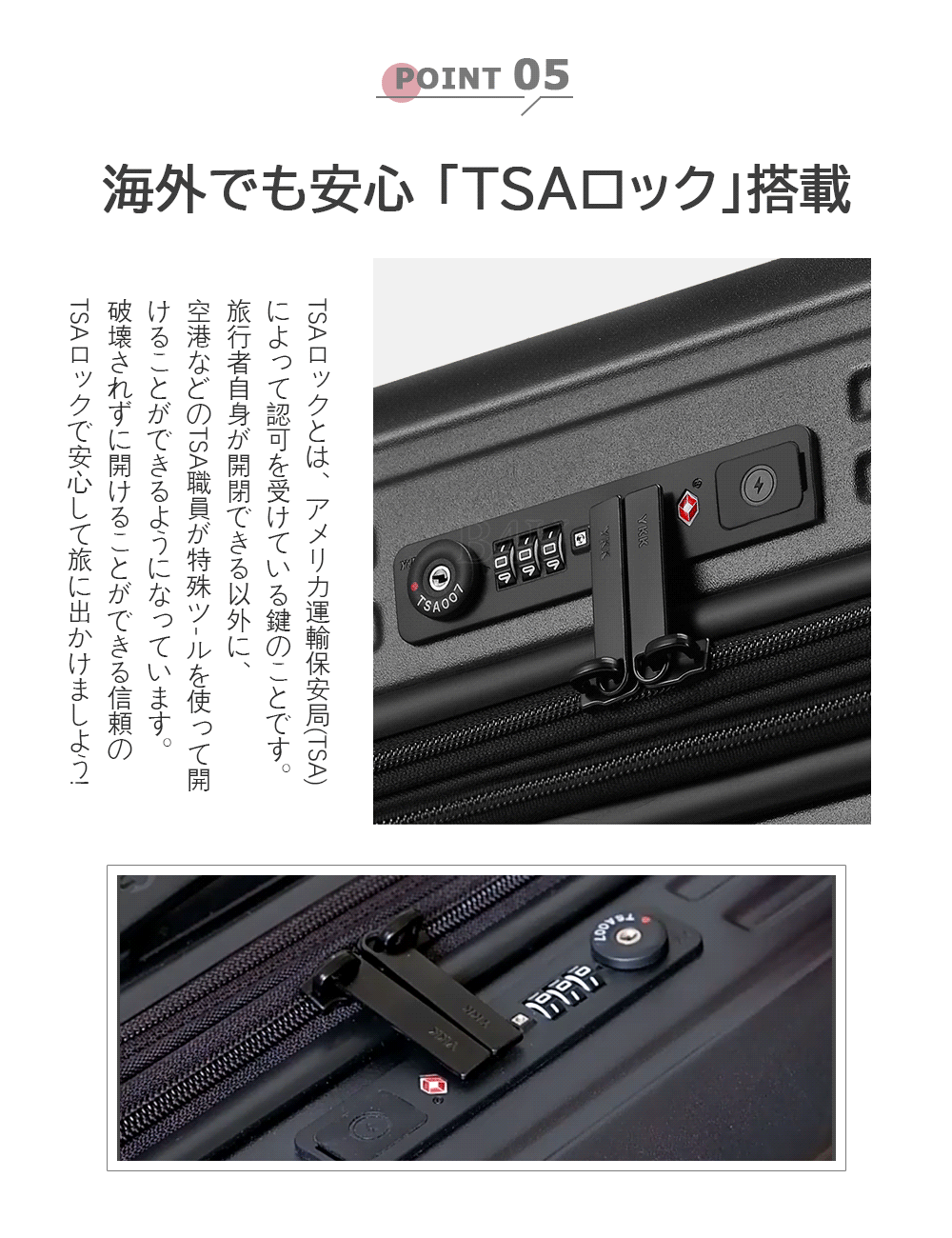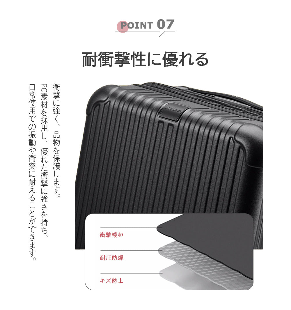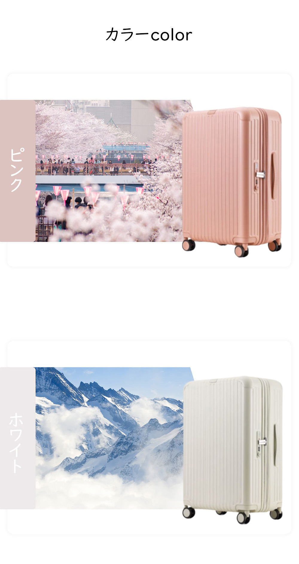 | ●商品ポイント | ☆【素材】PC材質により軽量で頑丈なボディが実現し、衝撃からスーツケースを守ります。 ☆【静かなキャスター】高品質のダブルキャスター、より優れた静音効果と耐摩擦性、360度自由に回転できる、スムーズな動きを実現できる、さまざまな地面に適しています ☆【乾湿分離デザイン】 旅行時や使用後のおしぼりや汚れた服などを他の生活用品と分けて収納できるため、衛生的で清潔な状態を維持しやすくなります ☆【TSAロック】 TSAロックを搭載しており、海外旅行に対応します。 |
