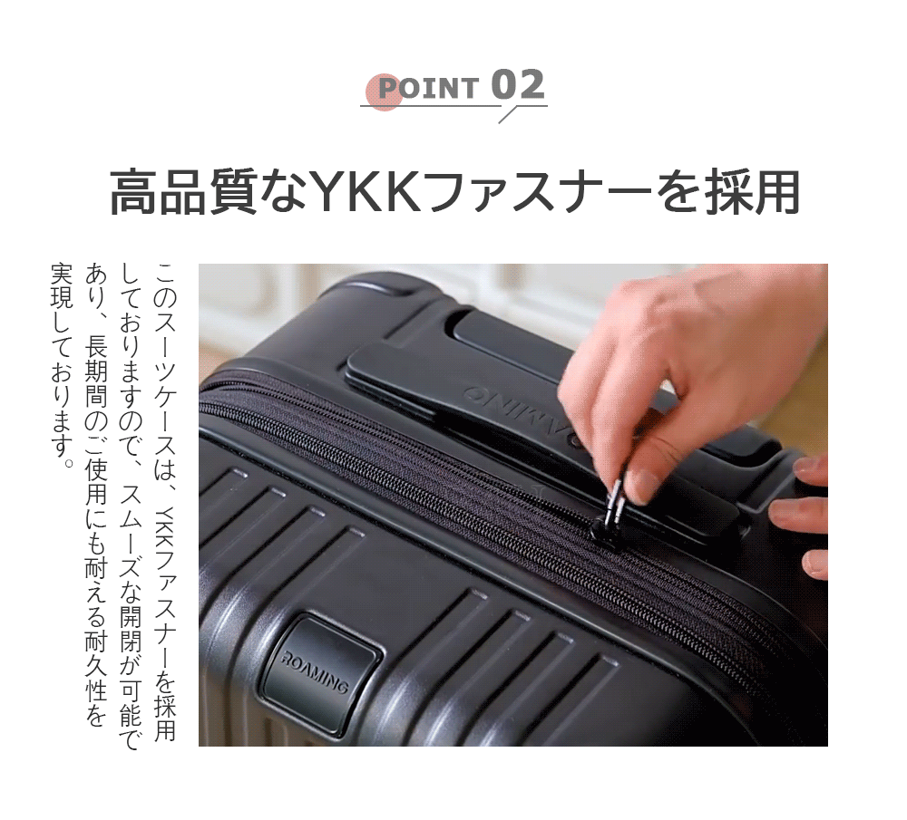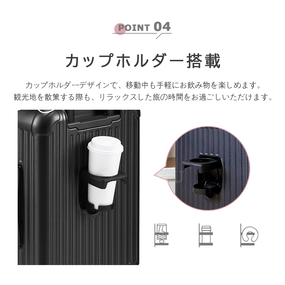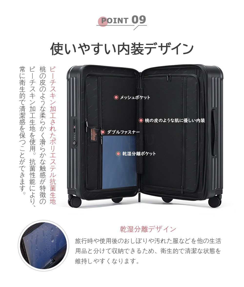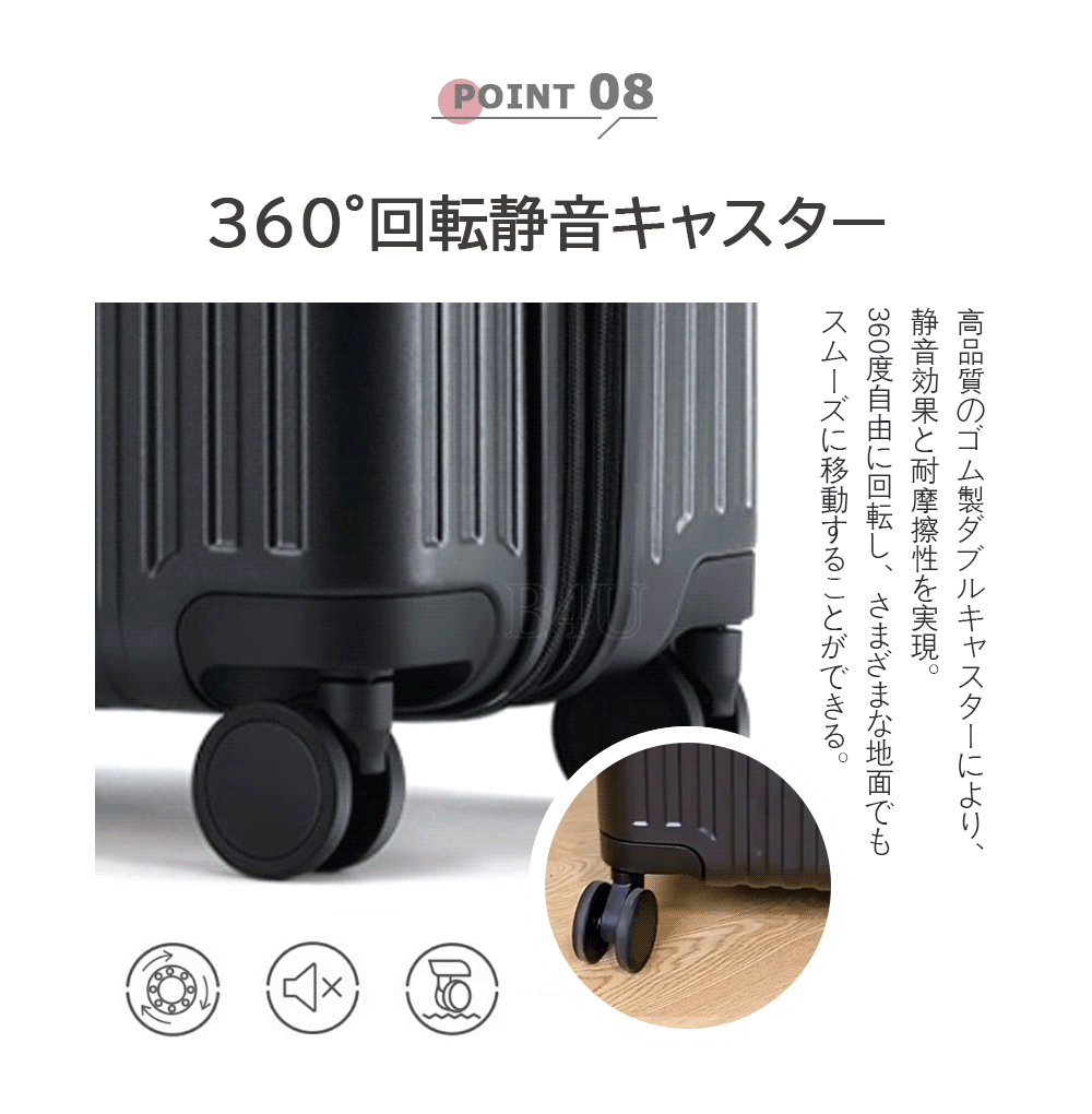 | ●商品ポイント | ☆【素材】PC材質により軽量で頑丈なボディが実現し、衝撃からスーツケースを守ります。 ☆【静かなキャスター】高品質のダブルキャスター、より優れた静音効果と耐摩擦性、360度自由に回転できる、スムーズな動きを実現できる、さまざまな地面に適しています ☆【乾湿分離デザイン】 旅行時や使用後のおしぼりや汚れた服などを他の生活用品と分けて収納できるため、衛生的で清潔な状態を維持しやすくなります ☆【TSAロック】 TSAロックを搭載しており、海外旅行に対応します。 |